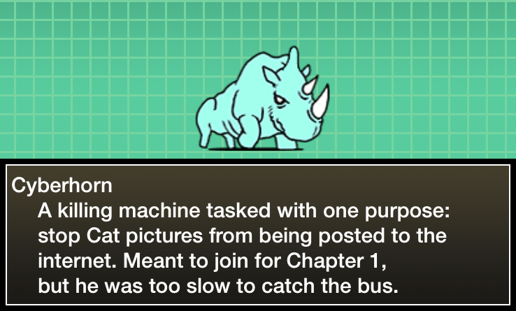 - Описание Киберрога ломает 4-ю стену, в предложении "Предназначен присоединиться к главе 1, но он был слишком медленным, чтобы поймать автобус."