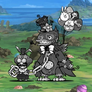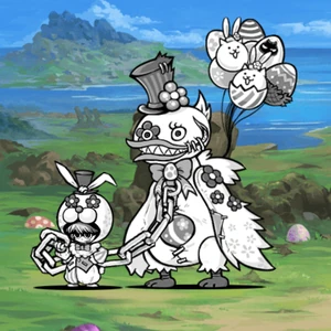 Bunny & Canard are an Uber Rare Cat added in Version 5.10 that can be unlocked by playing the Rare Cat Capsule during the Easter Carnival event. This unit is a reskin of Warlock & Pierre that attacks different types of enemies. True Form added in Version 11.4 grants Toxic and Surge Immunity but loses Zombie Killer and switches its target to Red and Aku enemies.