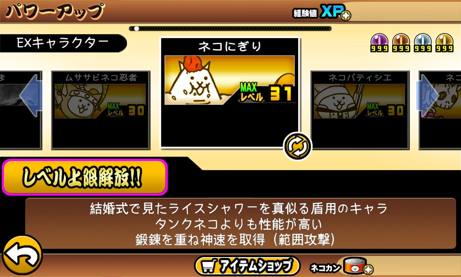 The Cat Unit also has to reach level 30 from XP upgrades first, therefore making it impossible for a player to use Catseyes on certain units before reaching specific User Rank levels, even if a player gained Catseyes beforehand.