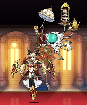 - True Form: Myrcia has taken off parts of her robotic coverings and now wears a ribbon-like cloth around her waist with gold shoes as well. The robot is now white and carries some flowers and more decorations. Myrcia has the signature futuristic hexagons around her. Attack gains even more roses.