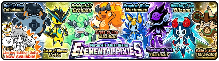 Nature's Guardians: Elemental Pixies (大精霊エレメンタルピクシーズ, Daiseirei Erementaru Pikushīzu, Great Spirit Elemental Pixies) is one of the Uber Rare Cat sets in The Battle Cats and Nyanko Daisensou added in the Version 6.5 Update. All Uber Rares in this set are anti-Alien and all include Barrier Breaker, Resist against Aliens, have relatively short recharge times, and one other special ability.