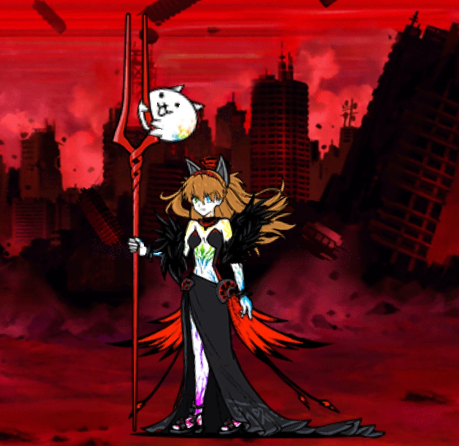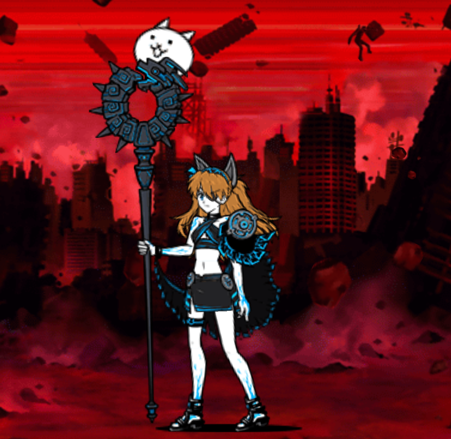 - Evolved Form: Asuka Langley in a red variant of Kasli, Daughter of Chaos' outfit instead, wielding the Spear of Longinus. Both her and the Cat have glowing rainbow veins.