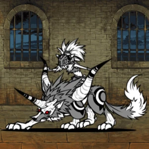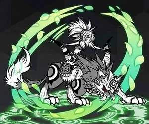 - Evolved Form: The wolf has been replaced by an almost identical cat-like creature that strongly resembles a lynx. It has lost its front horn, but its tusks and fox tail still remain, and its tusks now glow blue during the attack animation. The rider has taken off her mask, which is placed on the side of the creature.