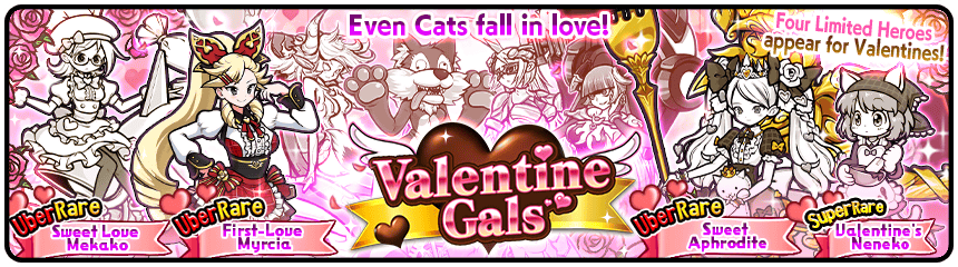 Valentine Gals (バレンタイン ギャルズ, Barentain Gyaruzu, Valentine's Day Gals) is a Seasonal Gacha Event that appears all of February. It features 2 new ubers: Sweet Aphrodite and First-Love Myrcia. It also features a new version of Neneko, Valentine's Neneko.